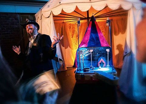 Conny´s AMAZING Flea Circus finns i två varianter. En stationär Cirkus som spelas för ca 10-15 personer åt gången, och en något mindre mingelvariant, där Conny själv söker upp och samlar publik.